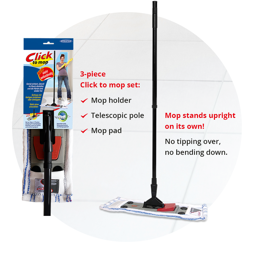 with a unique and patented upright function. The set with extendable telescopic handle can be used for both wet and dry cleaning and is also suitable for parquet and laminate.